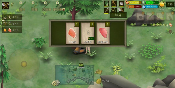 优先打造石斧与石刀,随后制作竹叉和弓箭,即可尝试捕猎青蛙、叉鱼、打鸟或兔子。
