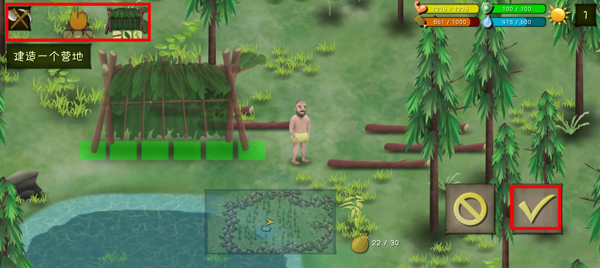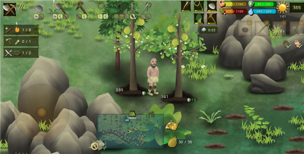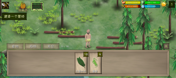 建好营地后外出采集资源并寻找食物,边走边吃,夜晚返回营地制作工具和陷阱。