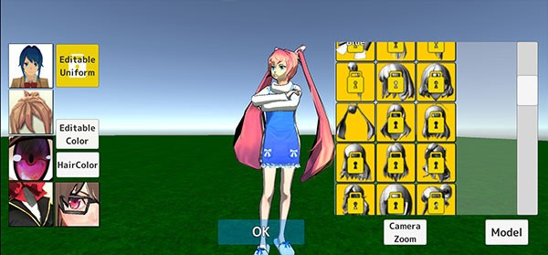 左侧区域提供套装、发型、眼睛、装饰及眼镜等自定义选项,右侧则展示尚未解锁的新造型,点击即可获取使用。角色装扮完毕后点击“OK”确认保存。右下角的Model区域还预设了多套精心搭配的人物造型,支持一键选用。