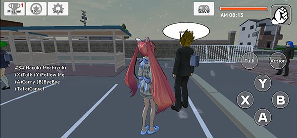以“前往学校”为例,接近其他同学后点击“talk”即可开启互动。此时左下角会出现操作提示:X键用于聊天,Y键可邀请对方跟随,A键实现携带同行,B键则表示道别,玩家可根据情境自由选择交互方式。