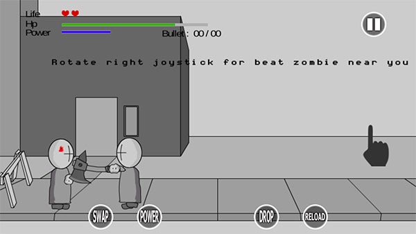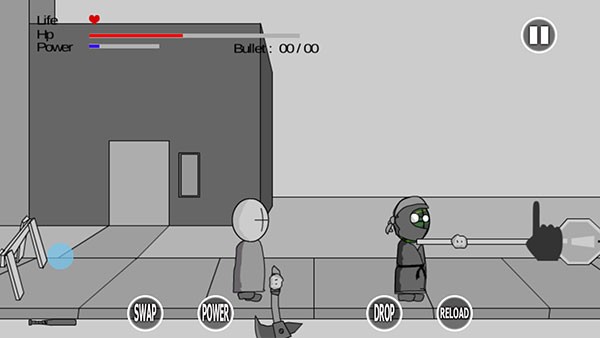 游戏中左侧屏幕的蓝色圆圈用于控制角色移动,左上角显示当前生命值,HP代表经验,Power表示力量值,需等待恢复。底部设有快捷操作键,例如“Drop”可释放机械手中拾取的武器。