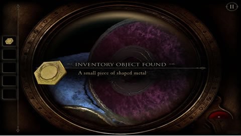 戴上完整眼镜,凝视盒盖,一个红色指纹显现。点击该位置并按下手印,中央圆块开启,获得一枚六边形铜片。