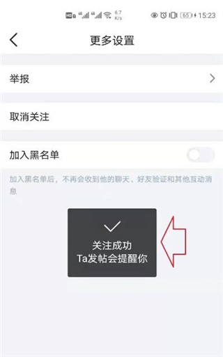 操作成功后会显示“关注成功”提示,此后对方发帖时你将收到提醒。