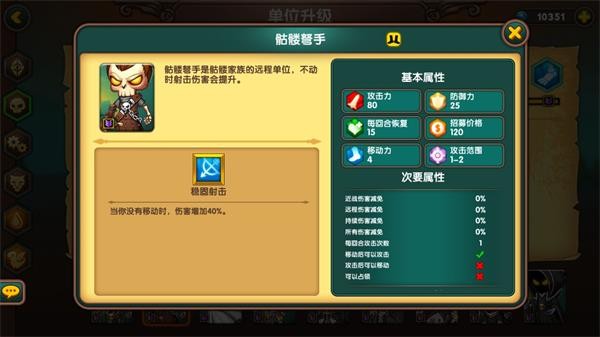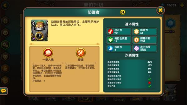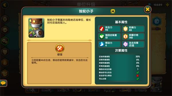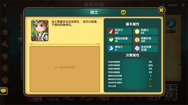 人族步兵是性价比极高的基础单位,拥有20%远程抗性,能有效对抗弓箭手,在平原地形还能获得5点攻防加成,整体属性均衡,无明显短板。