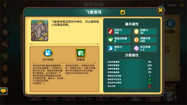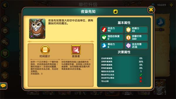 猫头鹰是兽族灵魂单位,飞行、高移速、30%远程抗性,技能强大,但需配合老虎或大象打出组合技,整体造价高昂,适合灵活游击战术。