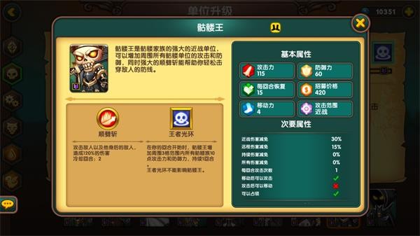 骨王身板扎实,420的价格合理,王者光环大幅提升亡灵军团整体战力,顺劈斩技能更是推进利器,能为弩手开辟进攻通道。