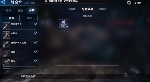 重复或闲置的武器可通过炼金术分解处理。稀有武器分解产出霜月晶矿,史诗武器获得冥河紫晶,传说武器则转化为黯阳余晖,这些材料后续用于武器进阶与铭文升级。