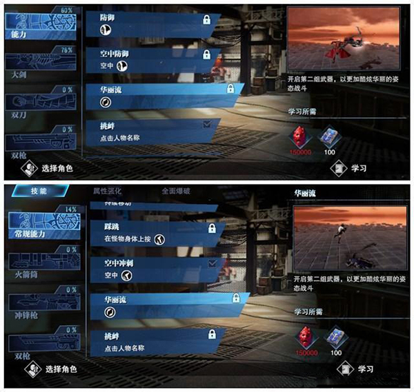 能力系统中包含“华丽流”分支,解锁后可在战斗中同时装备两把主武器。该机制支持实时切换,大幅拓展连招可能性,提升战斗表现力。需要注意的是,华丽流配置同样遵循角色与武器不通用原则。