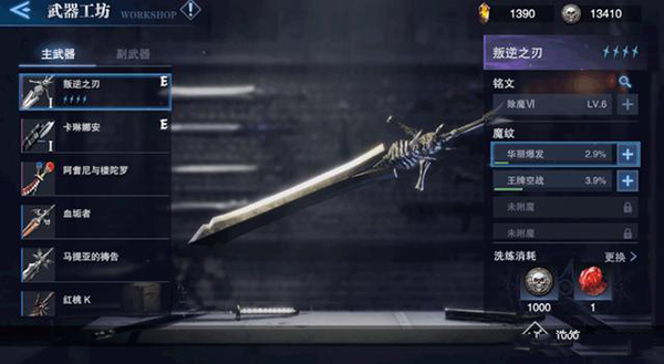 武器工坊是高阶养成的核心模块,提供铭文升级、魔纹洗练与附魔功能。仅史诗及以上品质武器具备铭文系统。此类武器初始自带两条魔纹,最多可扩展至四条,解锁额外魔纹槽需消耗星辰精金(商店售价500钻石)。