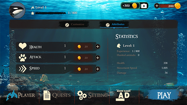 使用金币可提升虎鲸的各项属性,角色详细数据可在界面查看,确认配置后点击“play”开始游戏。