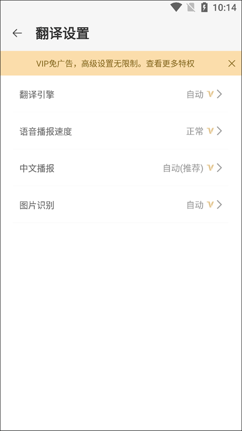 在翻译设置中,可调整翻译引擎、语音播报速度、中文播报开关以及图片识别相关参数。