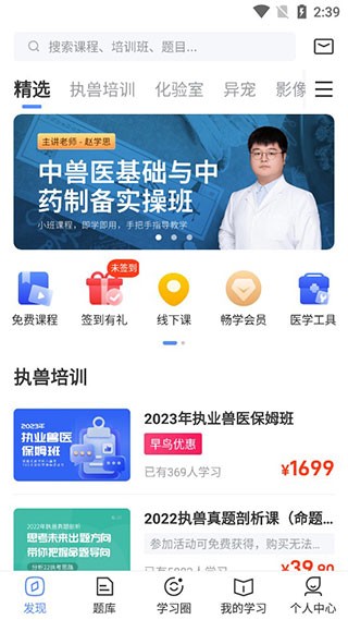 登录成功后,可在首页浏览与执业兽医考试相关的各类课程内容。