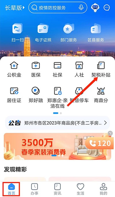 1、打开郑好办,在【首页】界面,选择右上方【契税补贴】选项,