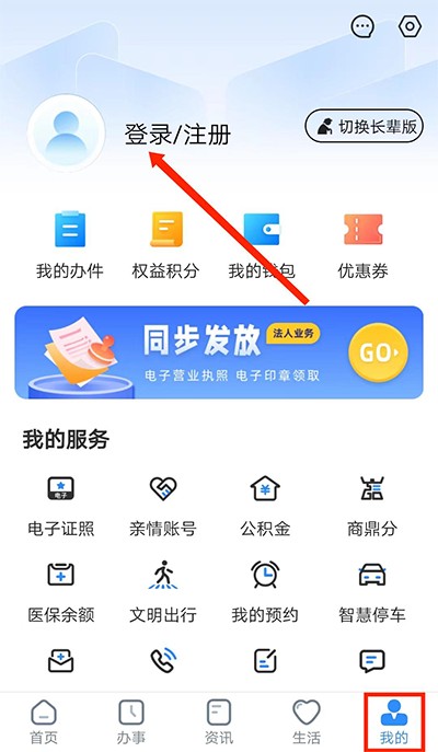 1、下载后打开郑好办,在【我的】界面,选择上方【登录/注册】选项,