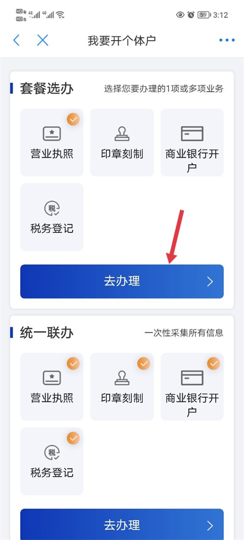 4、在套餐当中勾选营业执照点击去办理。