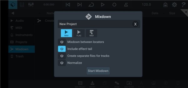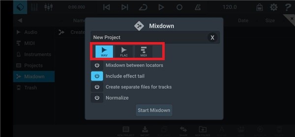 在左上角菜单中选择mixdown选项,并点击顶部的create mixdown开始导出流程。