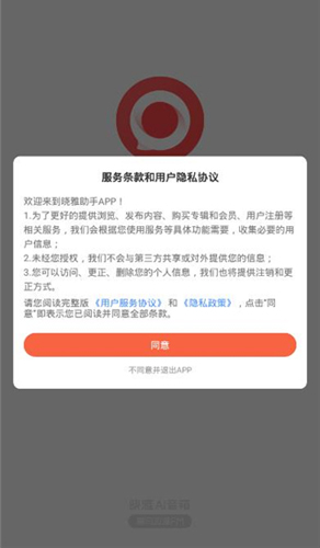 下载并打开晓雅助手后,需先点击【同意】按钮,方可进入账号登录流程。