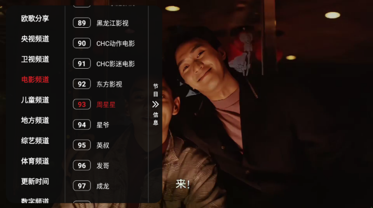 在直播页面轻触屏幕,即可从弹出菜单中选择心仪的电视频道进行观看。